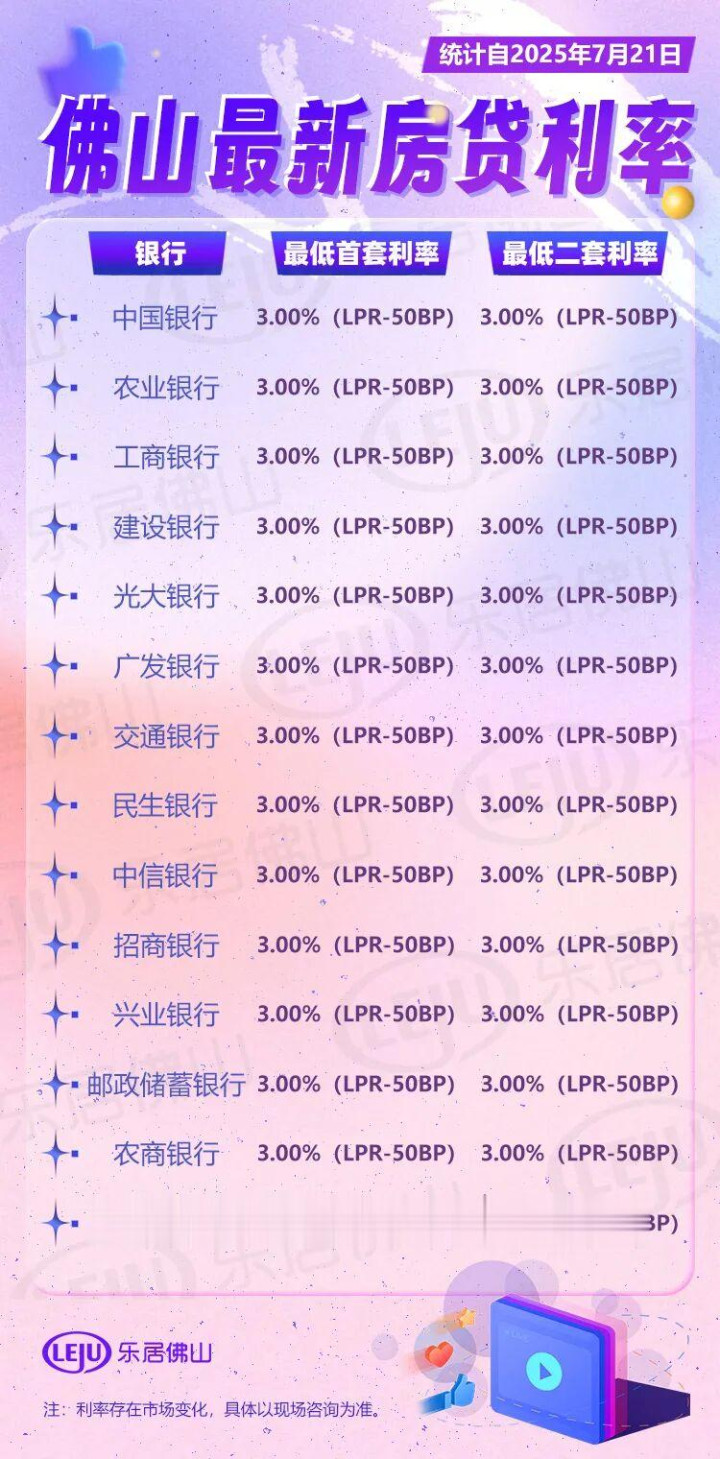 据悉,目前佛山各大银行执行的利率已经基本统一调整到了LPR-50bp,即3.0%上下。