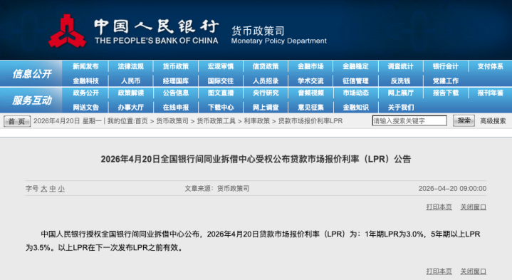 4月20日,中国人民银行授权全国银行间同业拆借中心公布,2026年4月20日贷款市场报价利率(LPR)为:1年期LPR为3.0%,5年期以上LPR为3.5%。以上LPR在下一次发布LPR之前有效。