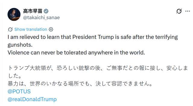 在事件发生后,高市早苗第一时间就在X平台发文称:“得知特朗普总统在那令人惊恐的枪声之后安然无恙,我感到如释重负。”她还强调:“暴力在世界任何地方都绝不能被容忍。”